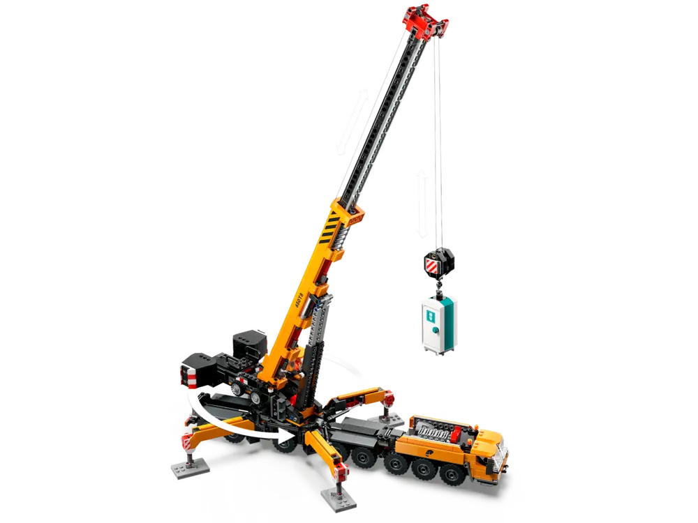 Mit ausgefahrenem Ausleger und ausgeklappten Stützbeinen ist der Kran aus diesem 1.116-teiligen LEGO® City Set 68 cm hoch, 48 cm lang und 25 cm breit.